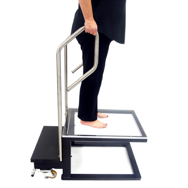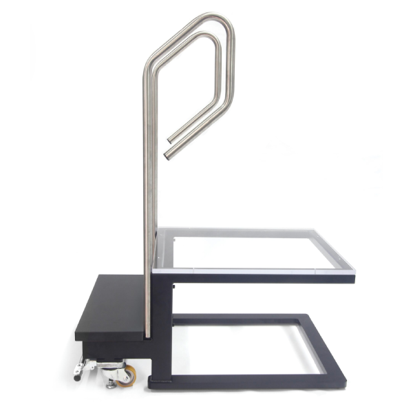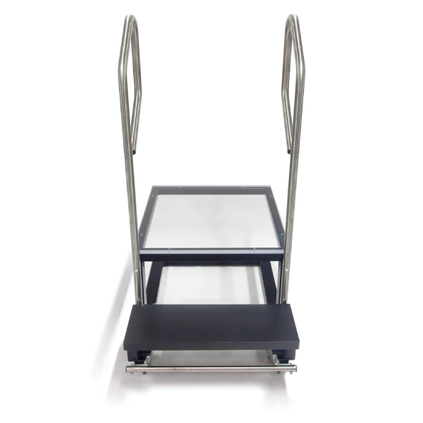 Built for durability and safety, the platform features a welded steel frame, stainless steel handrails, and a clear polycarbonate top. This robust construction provides stable support with a weight capacity of over 500 pounds.